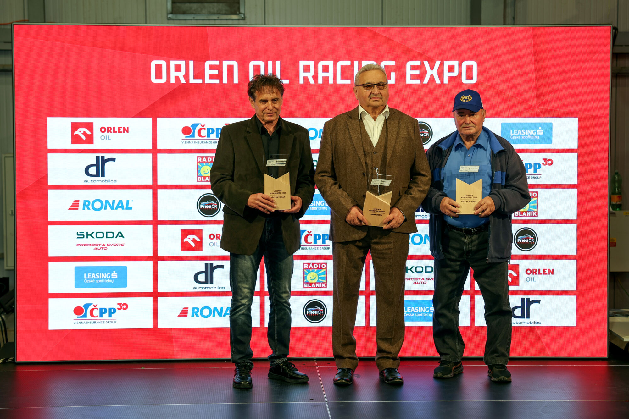 04 – Novými Legendami autosportu se stali (zleva) autokrosař Václav Fejfar, okruhář a vrchař Josef Michl a rallyový jezdec Václav Blahna (Foto: Prague Car Festival / Petr Frýba)